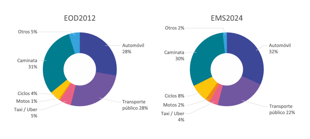 Le siguen los viajes en auto, con un aumento de cerca de dos millones de viajes, convirtiéndose en el modo más utilizado (32%), indica el reporte de la EMS 2024.