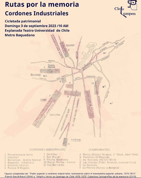 “La curatoría de los sitios a visitar tiene que ver con un recorrido que no abarque más de 20 kilómetros y que resalte los hitos trascendentales en cada una de estas rutas. En particular la de los cordones industriales, aborda la parte sur de Santiago, donde había una aglomeración de bastantes industrias y había harto movimiento social en aquella época. Hay harto lugar importante de visitar y también porque marcó un punto o una zona de la capital donde hubo resistencia para el momento del Golpe”, finaliza Carolina.