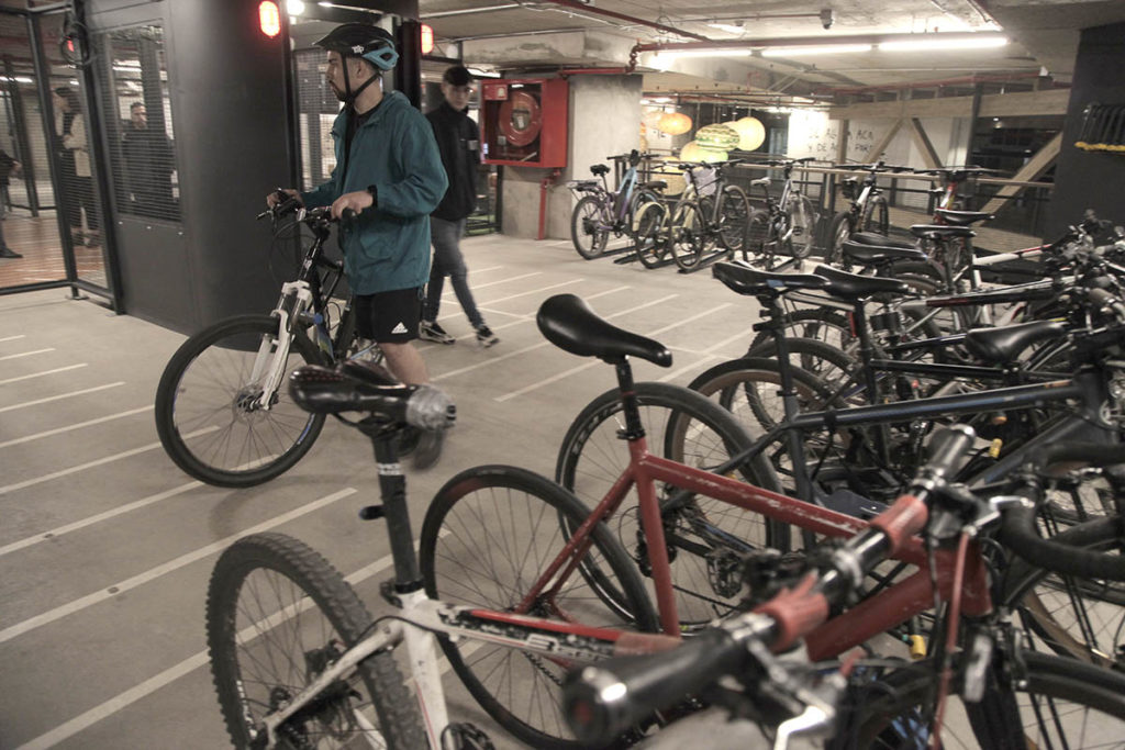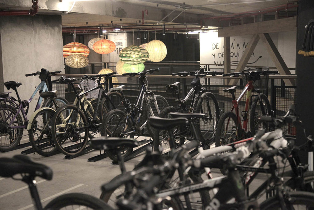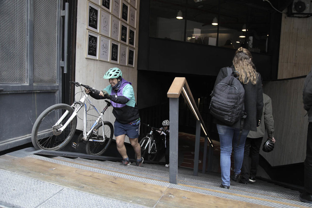 Fueron meses de visitar otros biciestacionamientos, probar tecnologías e infraestructura. Por ejemplo, en la instalación de los racks de las bicis, se consideró un modelo en dos niveles -una bici va arriba y otra abajo- para usar mejor el espacio, y también para no entorpecer el pasillo para el resto de los ciclistas cuando transiten por el lugar. Los que son más simples, se consideró que su forma permita amarrar el marco de la bici y no solo la rueda, como ocurre con los que están en algunas zonas públicas.
