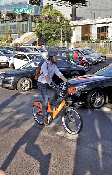 En octubre de 2013, las calles de Santiago comenzaron lentamente a teñirse de naranjo. La forma de moverse por la ciudad ya no dependía de un automóvil, un bus o el Metro. Comenzaban a aparecer las bicicletas compartidas, de la mano de las primeras políticas de movilidad urbana que incluían la construcción de ciclovías -en zonas urbanas y comerciales negadas en el pasado para ese tipo de vehículos- en comunas como Santiago o Providencia, y de la masificación de la bicicleta como medio de transportes.