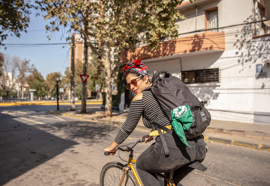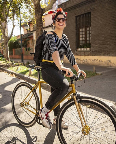 Creo que siempre hay un peligro de moverse, transportarse en cualquier medio que sea. Tal vez claro en la bicicleta vas muy expuesta, pero creo que siempre va a ser mejor y más seguro que todo dependa de ti, que tú manejes y no estar a merced de otra persona que maneja y que tú no tienes idea del criterio y claro que uno se cae y sufre a veces andando por la ciudad, pero uno aprende y es más rápido el aprendizaje. Creo que uno aprende a mirar distinto, a escuchar y a estar más atenta y prever, anteponerse a cualquier situación que pudiera llegar y claro también está la gravedad siempre para recordarte que existe a pesar de lo que tú creas y a veces es bueno reconciliarse también con el suelo. En especial a las mujeres que tienen miedo de subirse a una bici y andar por la calle o transportarse de esa manera, tomarse las cosas con tiempo, estar atenta y fluir con el tráfico y empoderarse de ese lugar también y tomarse el lugar en la calle, no como irse muy cuneteada porque así te van a cuidar más, no, tomarse el pedazo de calle y que convivamos todos los que pertenecemos a la calle. Somos fuerza también y somos muches.