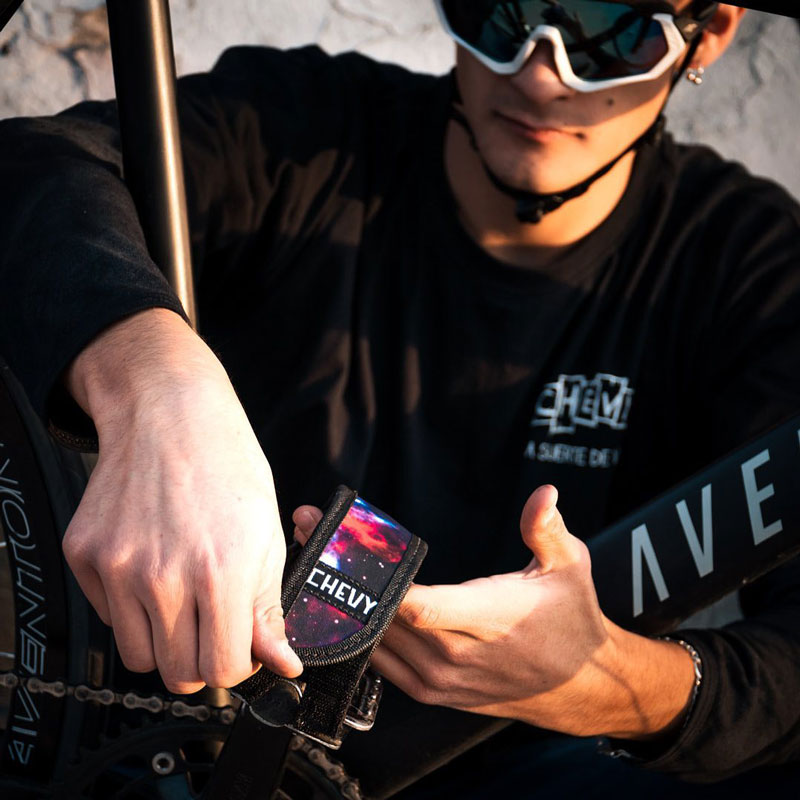 Los STRAPS, fijan el pie al pedal para hacer presión hacia adelante, jalar hacía atrás o saltar la rueda trasera de la bicicleta. Con la confección de este fundamental accesorio comenzó CHEVY, un emprendimiento fundado por Alexis Espinoza y su pareja en 2014.