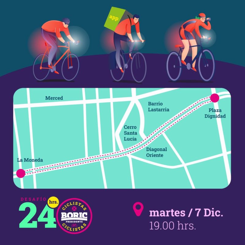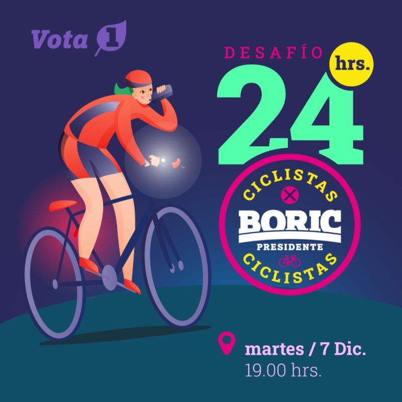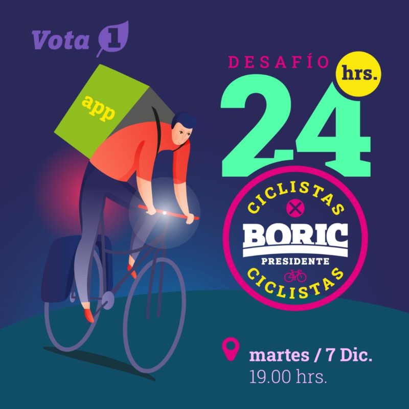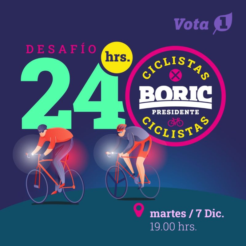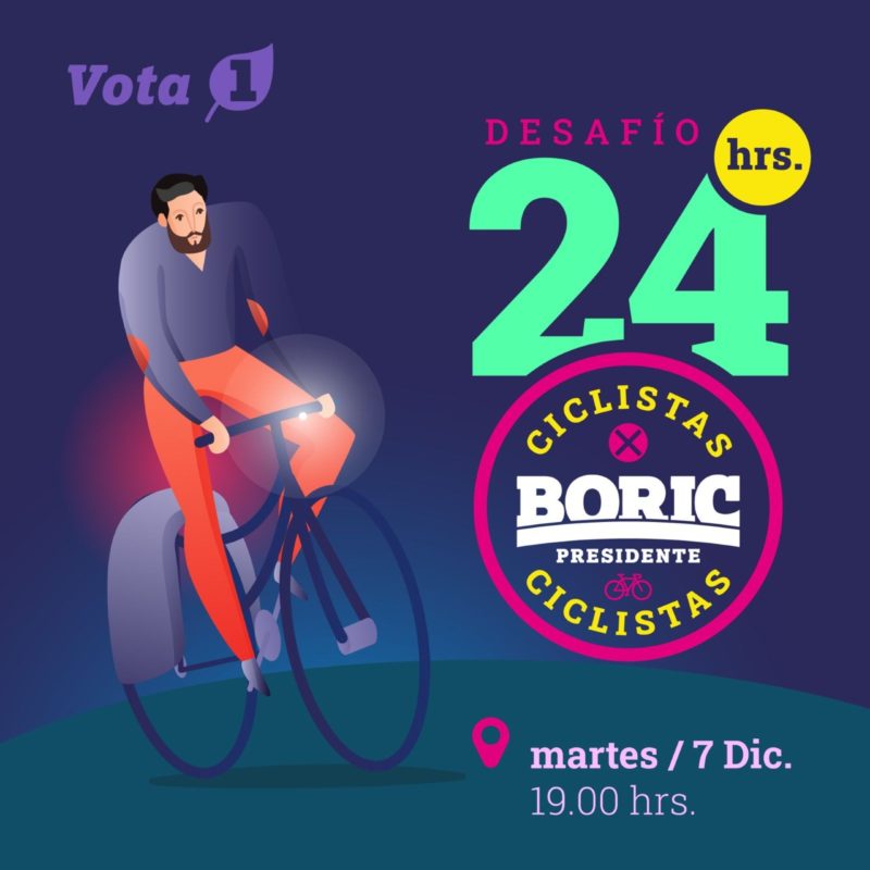 El próximo martes 7 de diciembre desde las 19:00 horas, en la explanada de la Plaza Dignidad, comenzarán las “24 horas en bici x Boric”, idea propuesta en la primera asamblea abierta de Ciclistas x Boric, el martes 30 de noviembre.