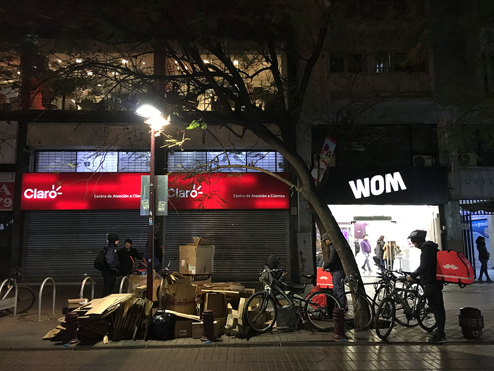 Miércoles. 16.45 horas. “Lo máximo que pagan por un pedido en el sector Oriente de Santiago son 2600 pesos”, cuenta José Vicente García sentado en unas bancas ubicadas en la esquina de Merced con Miraflores. Originario de Caracas, espera que salga algún traslado como socio conductor de la aplicación Uber Eats. Según sus cálculos, puede desplazarse entre 20 y 35 kilómetros, dependiendo del movimiento que presente la jornada. Antes, explica, trabajaba 12 horas, pero redujo ese tiempo a 7 horas luego de conseguir un trabajo de medio tiempo. Hace unos meses sufrió una violenta caída. “Un auto abrió la puerta en Apoquindo sin percatarse que venía y me golpeó en la cabeza y me lanzó lejos”, recuerda. Dice que trata de no subirse a las veredas, pero asume que es difícil: “El GPS de la aplicación te da las indicaciones como si fueras peatón, pero no como ciclista, entonces a veces te manda contra el tráfico”.