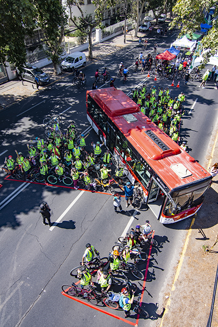 Realizada desde una plataforma telescópica de elevación y dron por un equipo de fotógrafos especializados en tomas aéreas, la actividad permitió demostrar a los ciclistas participantes que en los ángulos muertos o puntos ciegos de un bus se pueden ocultar de la visión del conductor casi un centenar de personas en bicicleta. Para Mariana Vega, ciclista participante, “aunque esto nunca se dará así en la práctica, es impactante verlo y experimentarlo, recordar las tantas veces que creímos que el conductor nos tiraba la micro encima adrede, cuando en realidad no nos veía”. Niños y adultos participantes pudieron también sentarse en el asiento del conductor del bus y comprobar con sus propios ojos las graves limitaciones de visión que afectan a conductores de vehículos mayores.