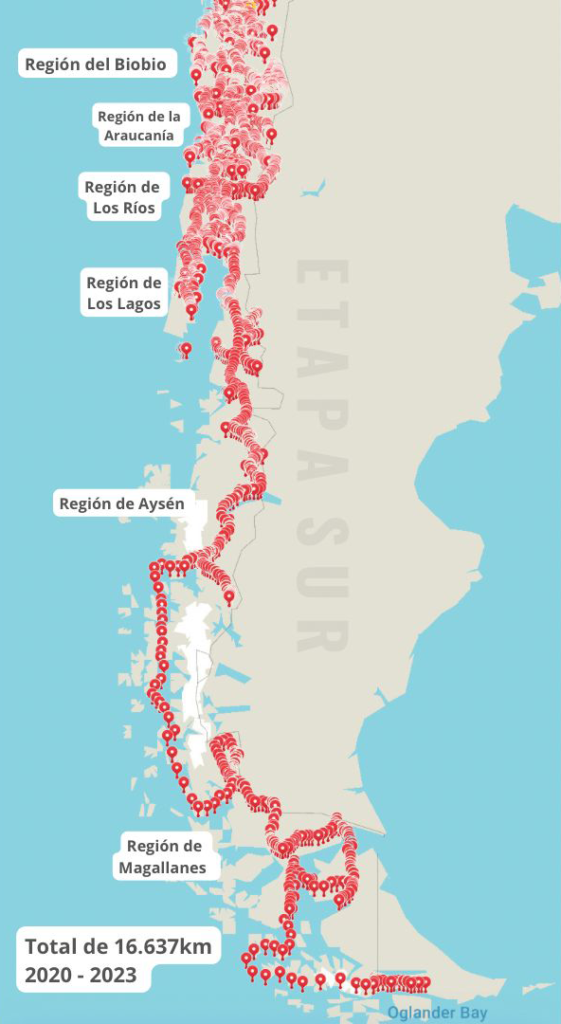 “La que me costó mucho fue la región de la Araucanía. No es tan grande, pero tuve que hacerlo en dos etapas, porque me tocaron incendios, me tocaron lluvias tremendas, conflictos políticos, un montón de cosas, y solamente en esa región. En marzo del 2023, estaba completando la Provincia de Malleco, que es como la provincia donde se contempla casi toda la zona roja de la Araucanía, y fue súper complicado, muy difícil, porque ahí no se trabaja mucho el turismo. Igual hay camping y esas cosas, pero no existe un trabajo coordinado como en la Provincia de Cautín”.