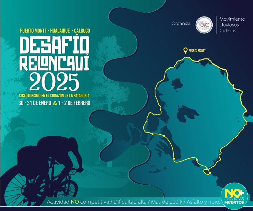 Entre el 30 de enero y el 2 de febrero, se va a estar realizando el Desafío Reloncaví 2025. La actividad organizada por el Movimiento Lluviosos Ciclistas, y que va en su cuarta versión, reunirá a más de 70 ciclistas que le darán una vuelta al seno de Reloncaví, en la Región de Los Lagos, pasando por lugares como Puerto Montt, Hualaihué y Calbuco. Son más de 250 kilómetros, entre asfalto y ripio, que no solo pondrán a prueba la resistencia de los participantes, sino que también destacará el potencial del cicloturismo en la región.