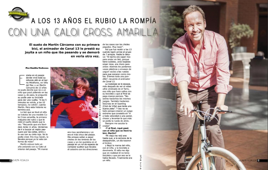 Pensada como una edición mensual, el primerísimo primer número de la revista tuvo secciones que iban desde lo editorial a lo cultural, con recomendaciones de libros, música, muestras fotográficas y tecnología. La nota principal hablaba de los eternos conflictos entre peatones y ciclistas. ¿El invitado a “Mi Primera Bici”? Nada más y nada menos que Martín Cárcamo.