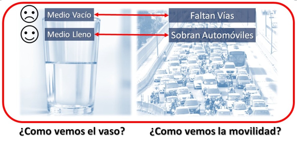 Ese enfoque de la oferta es el que ha logrado posicionar ideas como: “no hay vías” y creer que se deben construir vías a medida que aumenta el parque automotor. Ese enfoque ha degradado el modelo de ciudad y ha desviado las prioridades de espacio e inversión de nuestras agendas de desarrollo. “No hay vías para tantos autos”, dicen las personas para referirse a los problemas de movilidad de su ciudad. ¿No será mejor orientar el pensamiento de otra manera y permitirse la oportunidad de considerar la idea que no faltan vías, lo que sobran son autos? Esa oportunidad puede significar una visión más humana, más social e incluyente del territorio. Ver el vaso medio lleno es una exhortación a ver la ciudad de otra forma, una ciudad para las personas, no para las cosas y los artefactos.