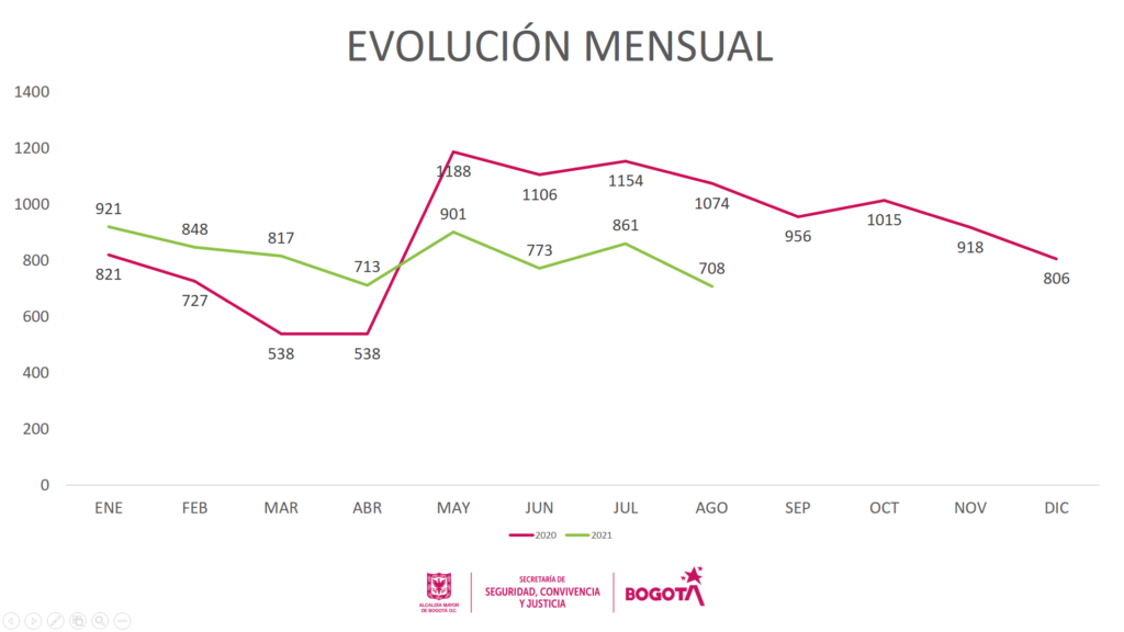 En lo corrido de 2021 en Bogotá han sido hurtadas 6.542 bicicletas, la siguiente imagen muestra el comportamiento mensual del hurto de bicicletas de 2021 comparada con 2020, a la fecha el hurto ha disminuido 8%, según cifras dadas por la Secretaría Distrital de Seguridad, Convivencia y Justicia – SDSCJ.