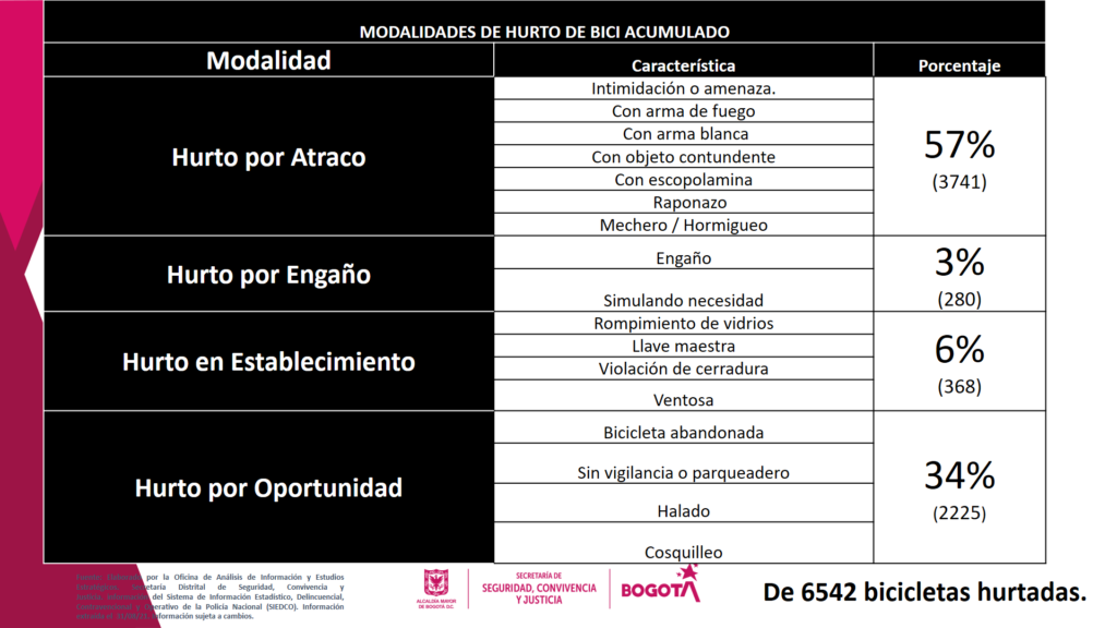 “Conviene resaltar la importancia de reforzar y diseñar acciones que consigan el mejoramiento de las condiciones de seguridad, toda vez que el indicador de hurtos a bicicletas durante el año 2019 fue de 8.130 de acuerdo con las denuncias reportadas en SIEDCO[2] y que la meta para el año 2020 es lograr una reducción del 5% que permita una reducción a 7.804 hurtos de bicicleta.”[3] En julio de 2020 se crea la Mesa de Seguimiento al Plan de Seguridad Ciudadana para ciclistas de Bogotá “la bici nos mueve con seguridad”, una instancia de seguimiento del cumplimiento y evaluación de las acciones adelantadas en los componentes de seguridad para los ciclistas en la ciudad.
