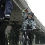 Híjole, realmente es difícil, me es complicado definir una foto. Digamos que por complicado, las de downhill, porque la verdad es muy extremo, a veces pasa la bicicleta muy pegada. Pero así como por historia, me gusta mucho cuando es el papá o la mamá que lleva a sus hijos. Bien o mal, aquí no hay todavía como esa tendencia a tener un carrito atrás para llevar a tus niños, que sería como lo ideal. Los llevan generalmente en una sillita que va en el tubo del medio, o un portabulto que va sobre la llanta trasera, y ahí van abrazando al motor, que es la persona, y a veces llevan a más de una. Ahí tengo dos, tres imágenes. Una que se ve hasta la expresión de cansancio de la mamá porque lleva a uno en brazos, a otro sentado, pero es muy temprano. Y no dudo que lo ha de hacer diario, o por lo menos un par de veces a la semana. Y no digo que sea malo, pero me marca esa fuerza que llegan a tener. De decir no me voy a detener. El transporte público va a tardar horas. Un coche también va a tardar más. Me voy en bicicleta. Y se van y avanzan. Eso es lo que me gusta. Las personas que tomo así me refleja esto de yo quiero avanzar. ¿Cómo? Pues en mi bicicleta. Esas son las que más me han gustado y más me han marcado”.