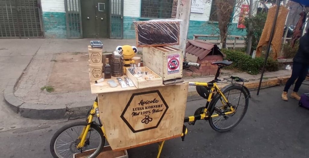 Díaz tiene un carrito que adhiere en su bicicleta de carga para apoyar en las Bicimingas. También todos los repartos de sus productos los hace en bicicleta, pero la particularidad de La Beecicleta es que en la cargo bike se le monta una mesa en forma de cajón, y se ofrecen diversas piezas hechas a base de miel.