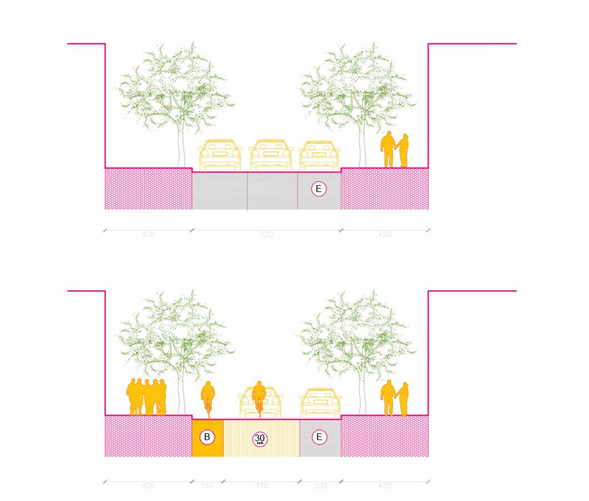Medidas de infraestructura Específicamente se propone quitar una de las dos pistas de automóvil dejar solo una y transformarla en Zona 30, de esta forma la pista es compartida entre automóviles y bicicletas y queda espacio para una ciclovia unidireccional en contraflujo para las bicicletas que van en dirección contraria a la dirección de la calle (Figura 1).