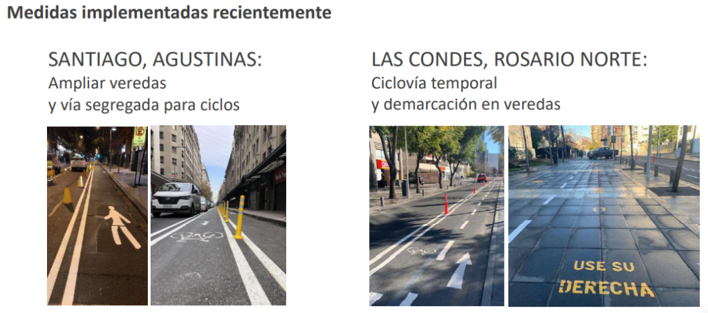 “El impacto del covid-19 en la forma en que las personas se mueven en las ciudades es innegable y nos impone el desafío de buscar nuevas fórmulas que permitan desplazamientos más seguros para todos. Eso requiere ampliar la mirada y habilitar nuevos espacios en calzadas, veredas y también en la gestión del transporte, de modo que aumentemos la capacidad disponible para los usuarios”, señaló la ministra Gloria Hutt.