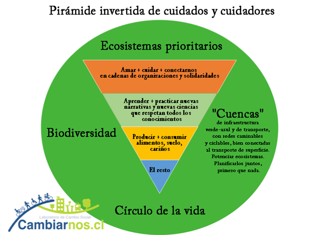 Tal como hicimos con la pirámide invertida del transporte, necesitamos invertir prioridades, poner el cuidado en primer lugar (figura), en todos los sentidos y las escalas. Con cuidado, tenemos altas probabilidades de sortear este experimento con un mínimo de sufrimiento. De tejer una economía más sana y justa. Sin cuidado, arriesgamos quedar atrapados en un invierno de encierros, pérdidas y duelos casi infinitos.