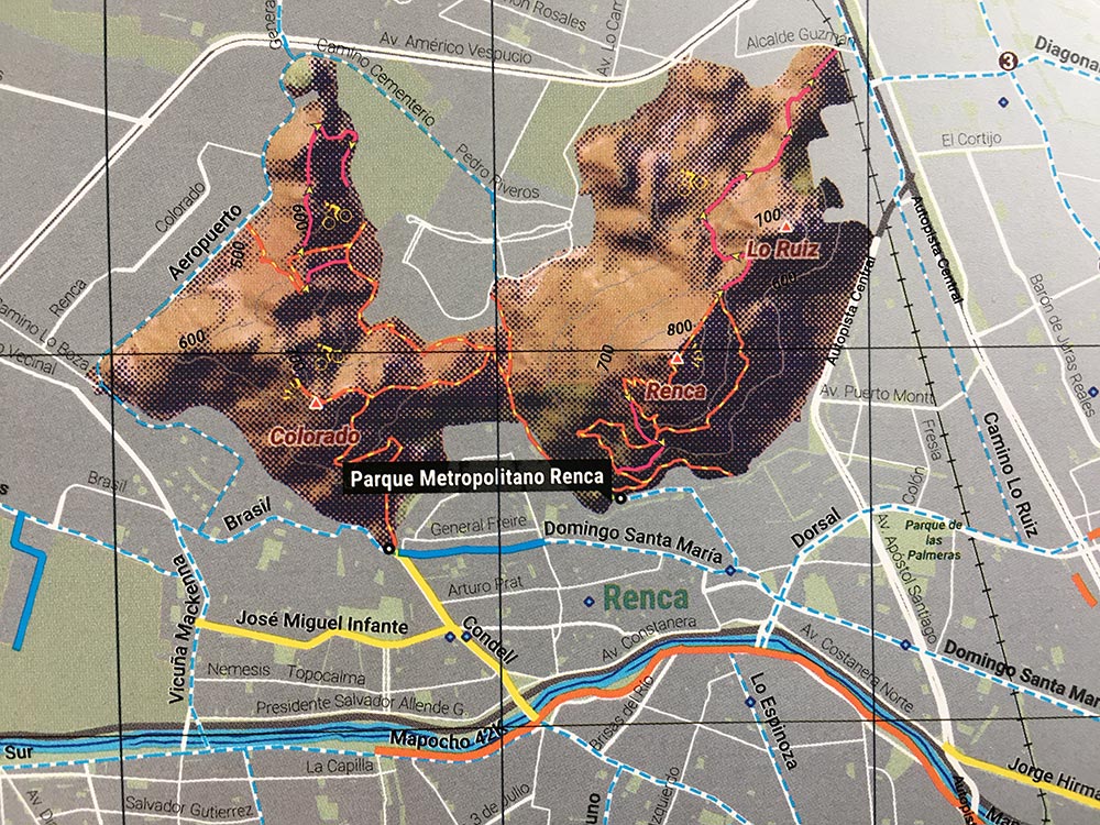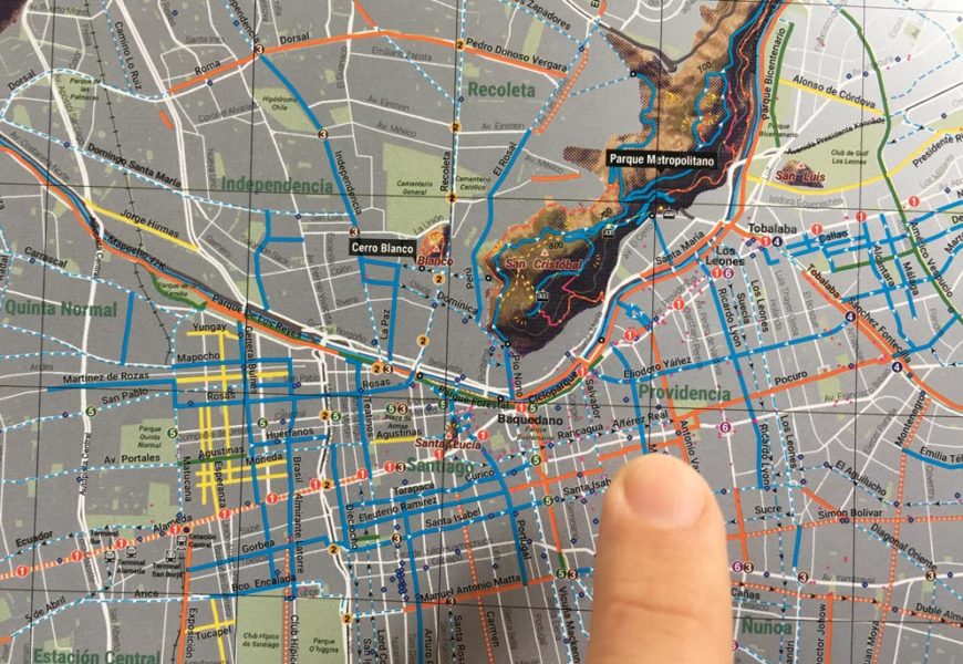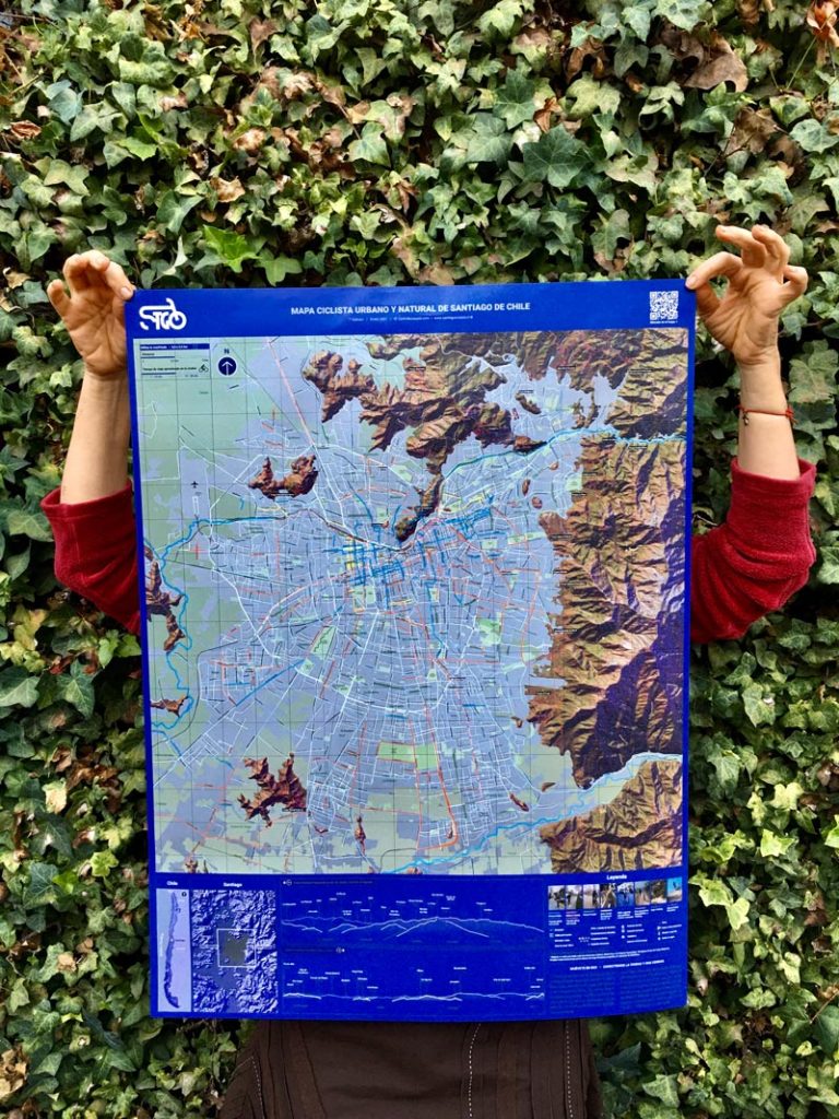 Esta primera edición del mapa incluye ciclovías categorizadas, rutas de MTB, trekking y descenso, calles sugeridas para pedalear, talleres de bicicleta, estacionamientos públicos para bicicletas, grilla distancia/ tiempo de pedaleo, además de nombres de cerros y quebradas, los mejores miradores, red de Metro e infografías de los cerros de Santiago.