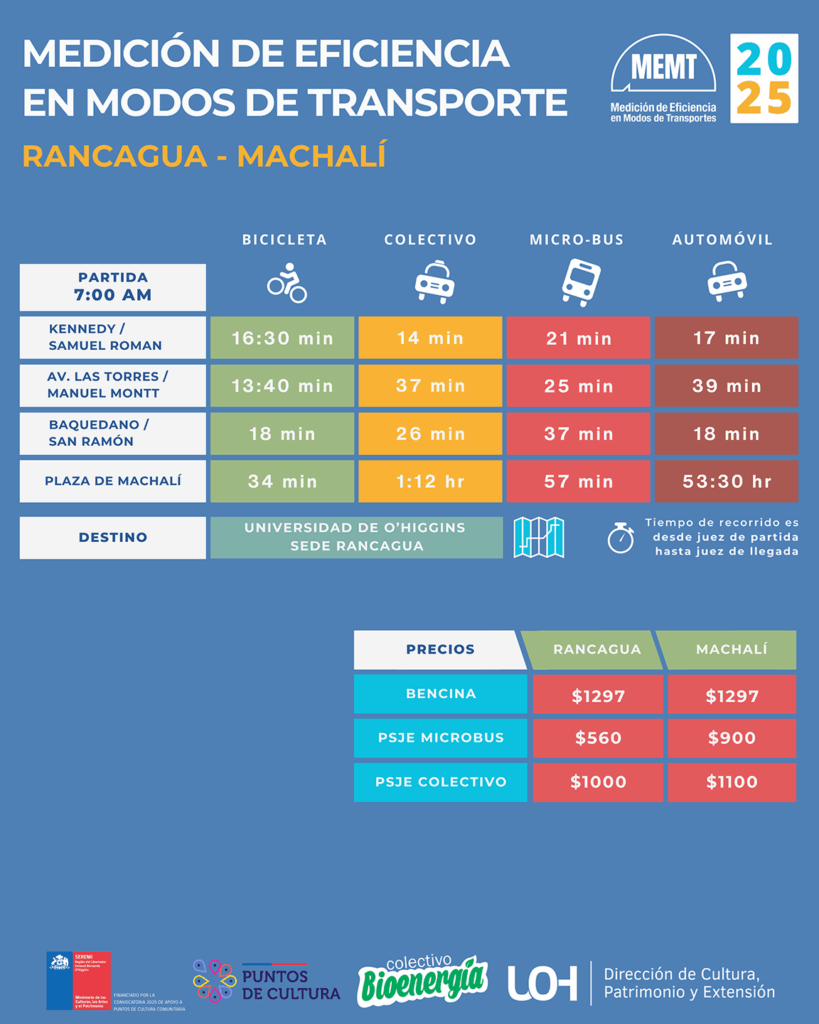Por cuarto año consecutivo, la Medición de Eficiencia en Modos de Transporte (MEMT) volvió a tomar el pulso de la movilidad urbana entre Rancagua y Machalí. La actividad, organizada por el Colectivo Bioenergía en colaboración con la Universidad de O’Higgins y el respaldo del Ministerio de las Culturas, las Artes y el Patrimonio —a través del programa Puntos de Cultura Comunitaria— convocó a decenas de voluntarios y autoridades en una jornada marcada por el frío matinal y el compromiso ciudadano.