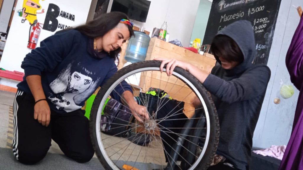Sin buscarlo, nos cuenta que se han conformado como un espacio político, por las distintas luchas de las que venía cada una: “En este espacio político siempre conversamos y reflexionamos a partir de temas como la autonomía, la autogestión, la economía popular y la participación en acciones más disruptivas, como cicletadas por les presos políticos y por la memoria, también organizamos talleres de mecánica básica para mujeres y disidencias”.