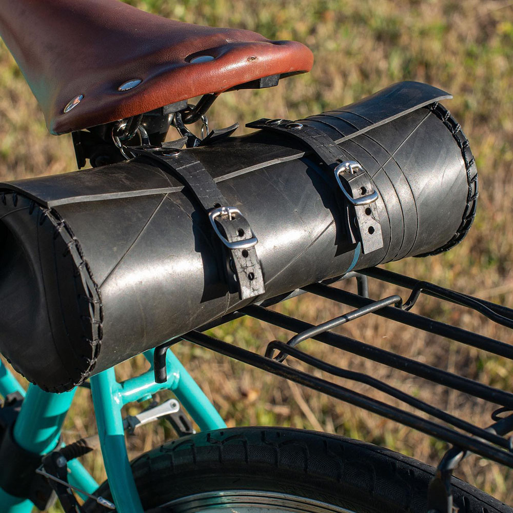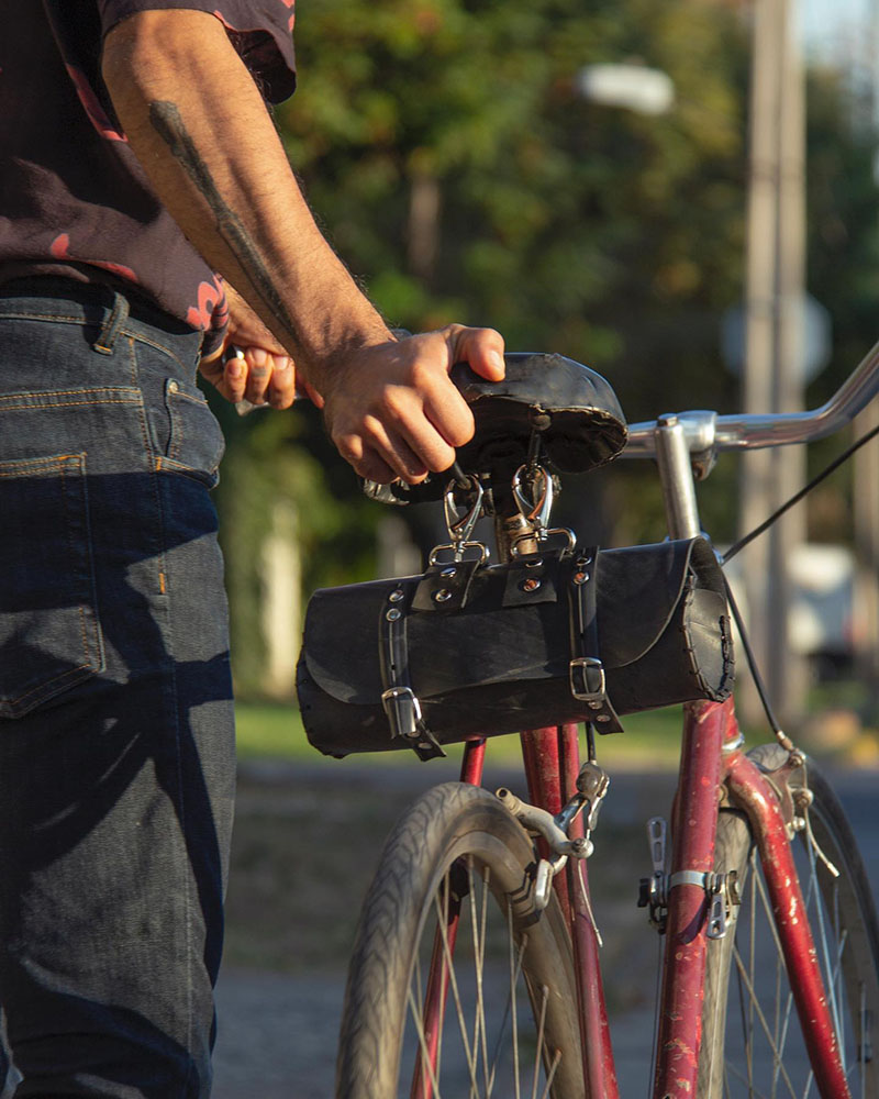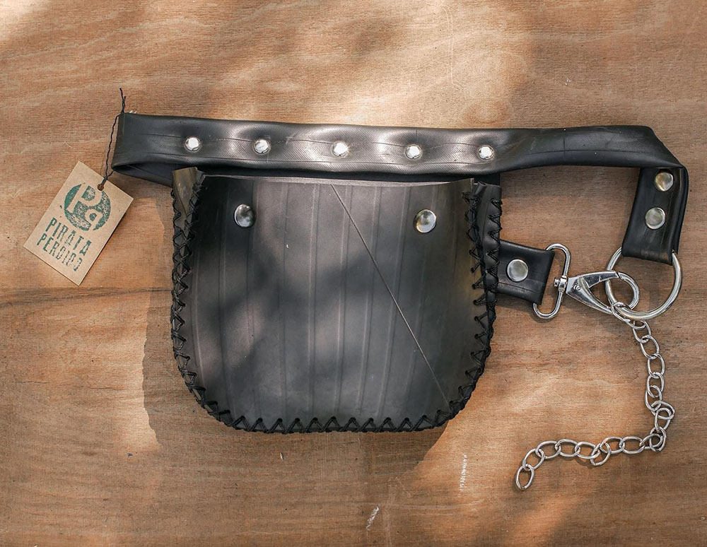 Diego y Paulina, los fundadores de Pirata perdido, testearon el caucho y descubrieron la manera de trabajarlo a escala combinando diseño, practicidad y triple impacto. Hoy trabajan las cámaras de camión y neumáticos de bicicleta con técnicas de marroquinería. “Desarrollamos una línea de productos para ciclistas y amantes de los ecoproductos, todos fabricados en base al caucho reutilizado, dándole una larga duración, impermeabilidad y resistencia al peso. Tenemos bananos, carteras, billeteras o mochilas y también Bikepacking como bolsos para el sillín, marco, manubrio y porta botellas. Próximamente lanzaremos un arnés reflectante y multifuncional con bolsillos desmontables para mayor visibilidad de los ciclistas”, cuenta Paulina Díaz, co-fundadora de Pirata Perdido.