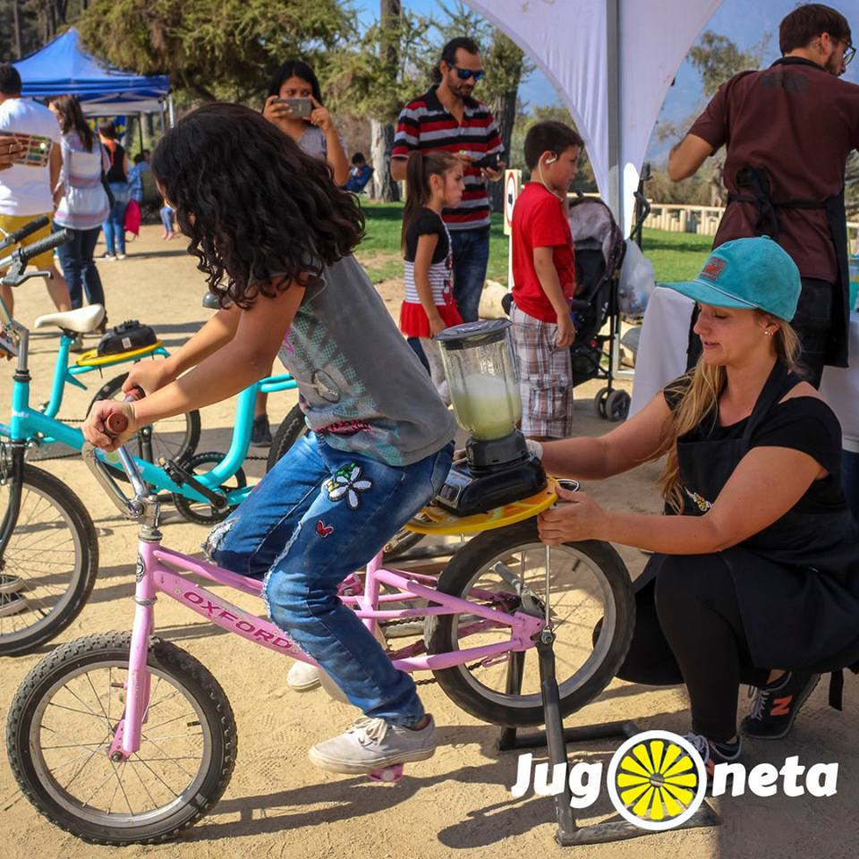 “Nos hemos estado moviendo en diferentes eventos, difundiendo nuestro emprendimiento a través de iniciativas y ferias ecológicas, como la Eco Feria Medioambiental en el pueblito de Las Vizcachas, donde las personas preparaban su propio jugo pedaleando. Por otra parte estamos en una campaña de reducir el uso de plásticos como son los vasos y bombillas, lo que es muy difícil. Estamos gestionando utilizar vasos hechos de plantas, totalmente reciclables y fomentamos el uso del vaso de vidrio retornable. El espíritu de nuestra participación en eventos y jornadas estimula a las personas a vivir la experiencia de generar energía para que la Jugoneta funcione, y que se sientan parte fundamental del cuidado al medio ambiente. Lo que buscamos es participar en eventos que tengan relación con el medio ambiente, la bicicleta y vida sana”.