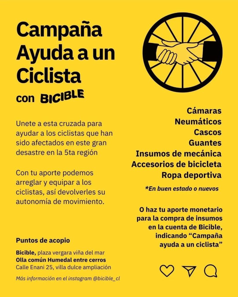 Como era de esperar, las organizaciones ciclistas de la V región también se han hecho parte de los trabajos en terreno y ayuda a las familias afectadas con distintas iniciativas.
