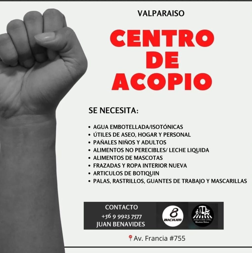 Los puntos de acopio son en Bicible en Plaza Vergara en Viña del Mar y el la Olla Común Humedal entre Cerros, en Calle Enani #25, Villa Dulce Ampliación.