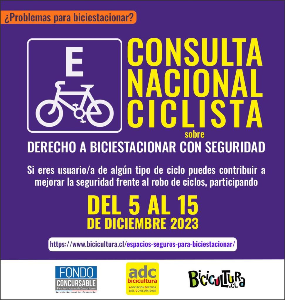 La consulta es parte del proyecto “Espacios seguros para biciestacionar: Difusión y defensa de un derecho conquistado”, ganador del Fondo Concursable para Asociaciones de Consumidores del Sernac 2023. El elemento central de esta campaña de educación a consumidores y consumidoras ciclistas es el espacio web Derecho a biciestacionar, en Bicicultura.cl, que reúne la información disponible y ofrece la posibilidad de recibir información personalizada y asesoría gratuita completando un formulario de solicitud.